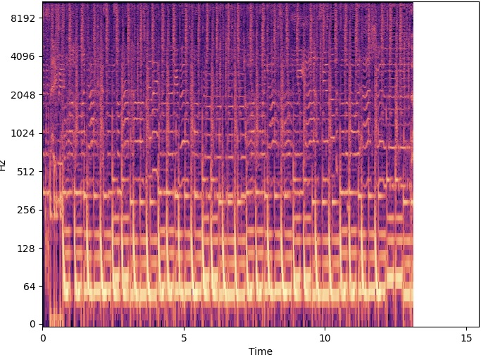 As heard above, carving in the frequency domain removed some frequencies that were deemed "unecessary" by the algorithm. When 200 seams were carved in the frequency domain, there was a slight difference but the audio quality was a little lower. When 600 seams were carved in the frequency domain, some of the "ringing" sound from the drums (I'm not sure what instrument") was carved out of the audio. The resulting spectrograms could be seen with slight modifications as well. The axis were static when I created them so the black line of padded zeros cannot be seen that well, but in the 200 seams carved image the seams appear near the top of the spectrogram.